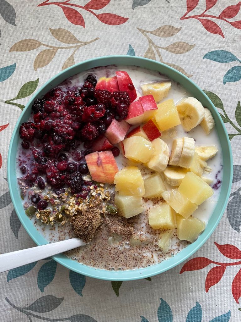 In picture I used frozen mixed berries, an apple, banana, pineapple, with granola, flax and milk. π